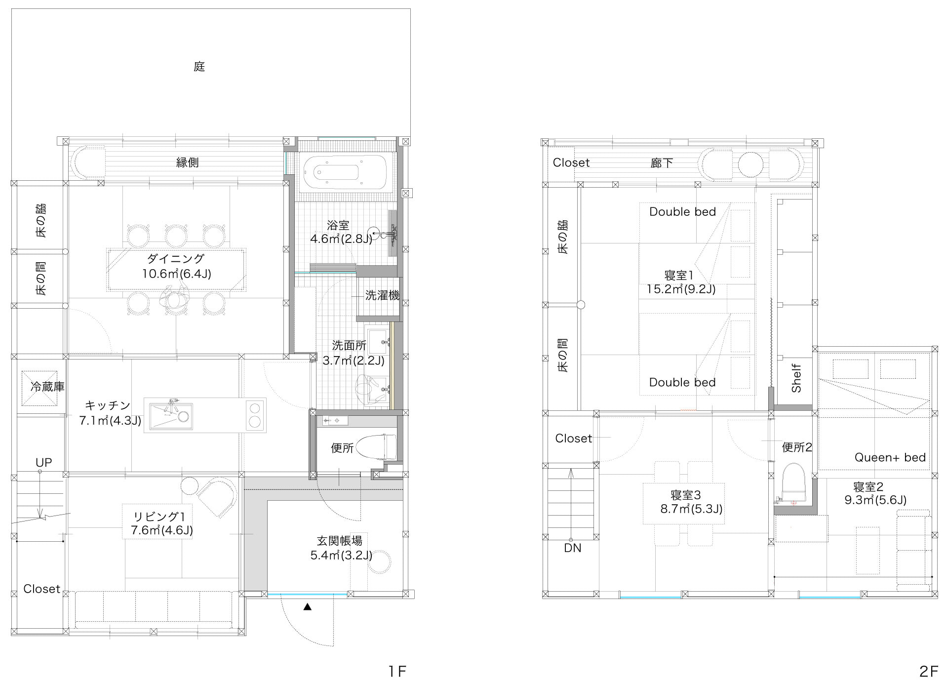 2階には、ダブルベッドを2台を設置したメインベッドルームと、クイーンベッドを1台備えたサブベッドルーム、4畳半の和室がございます。